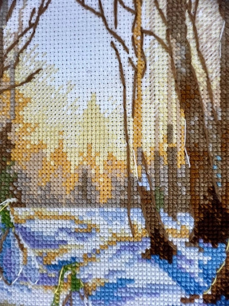 La combinación de tonos fríos y cálidos, junto con la textura característica de los hilos de lana/acrílico, aporta profundidad y un acabado pictórico muy especial. Bordado sobre tela Aida blanca Zweigart, el diseño destaca por su riqueza cromática y por la sensación de luz natural que transmite. Es un proyecto ideal para quienes disfrutan de bordados paisajísticos con un toque artístico.