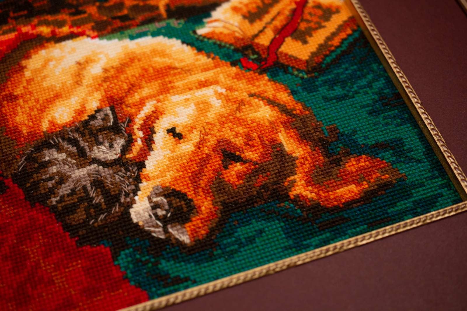 Déjate envolver por la calidez y la serenidad del hogar con el kit de punto de cruz “Junto a la Chimenea” de RIOLIS, un diseño acogedor y lleno de encanto que transmite paz y confort. La escena muestra a un perro y un gato descansando tranquilamente frente a una chimenea encendida, rodeados de libros y una taza de té, creando una atmósfera hogareña perfecta para los amantes de los diseños cálidos y entrañables.