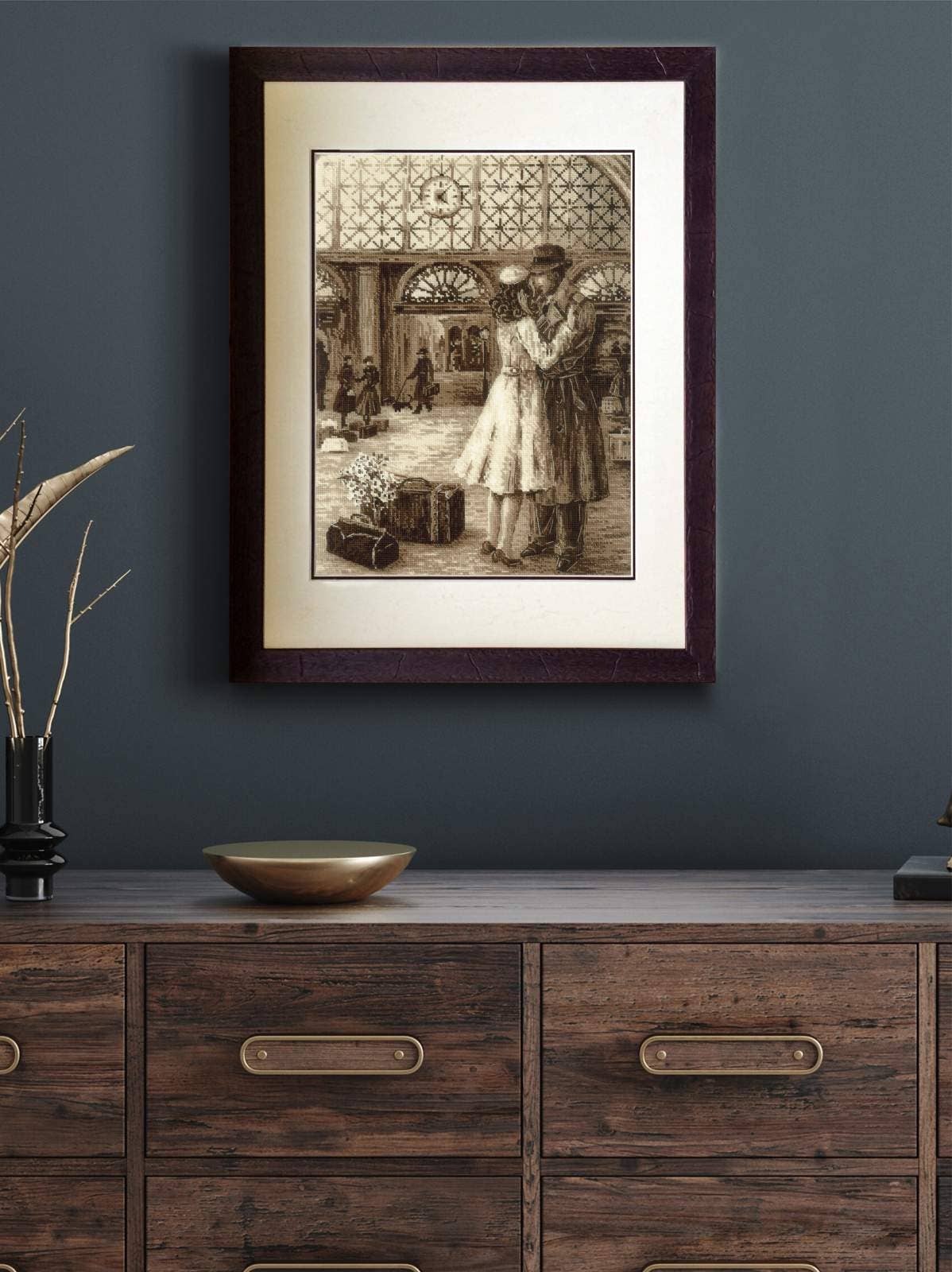 Viaja al pasado con el kit de punto de cruz “Foto Antigua. Encuentro” de RIOLIS, un diseño cargado de romanticismo y nostalgia que captura un emotivo reencuentro en una antigua estación. La escena, tratada como una fotografía sepia, transmite elegancia y sentimiento a través de gestos delicados y una composición clásica que evoca tiempos pasados y emociones profundas.