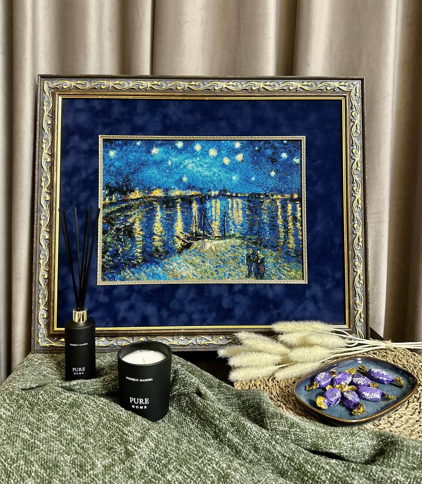 Sumérgete en la atmósfera mágica del impresionismo con el kit de punto de cruz “Noche Estrellada sobre el Ródano” de RIOLIS, una cuidada interpretación bordada de una de las obras más emblemáticas de Vincent van Gogh. El cielo profundo salpicado de estrellas, los reflejos dorados sobre el agua y la serenidad del río Ródano crean una escena hipnótica que transmite emoción, calma y sensibilidad artística en cada puntada.