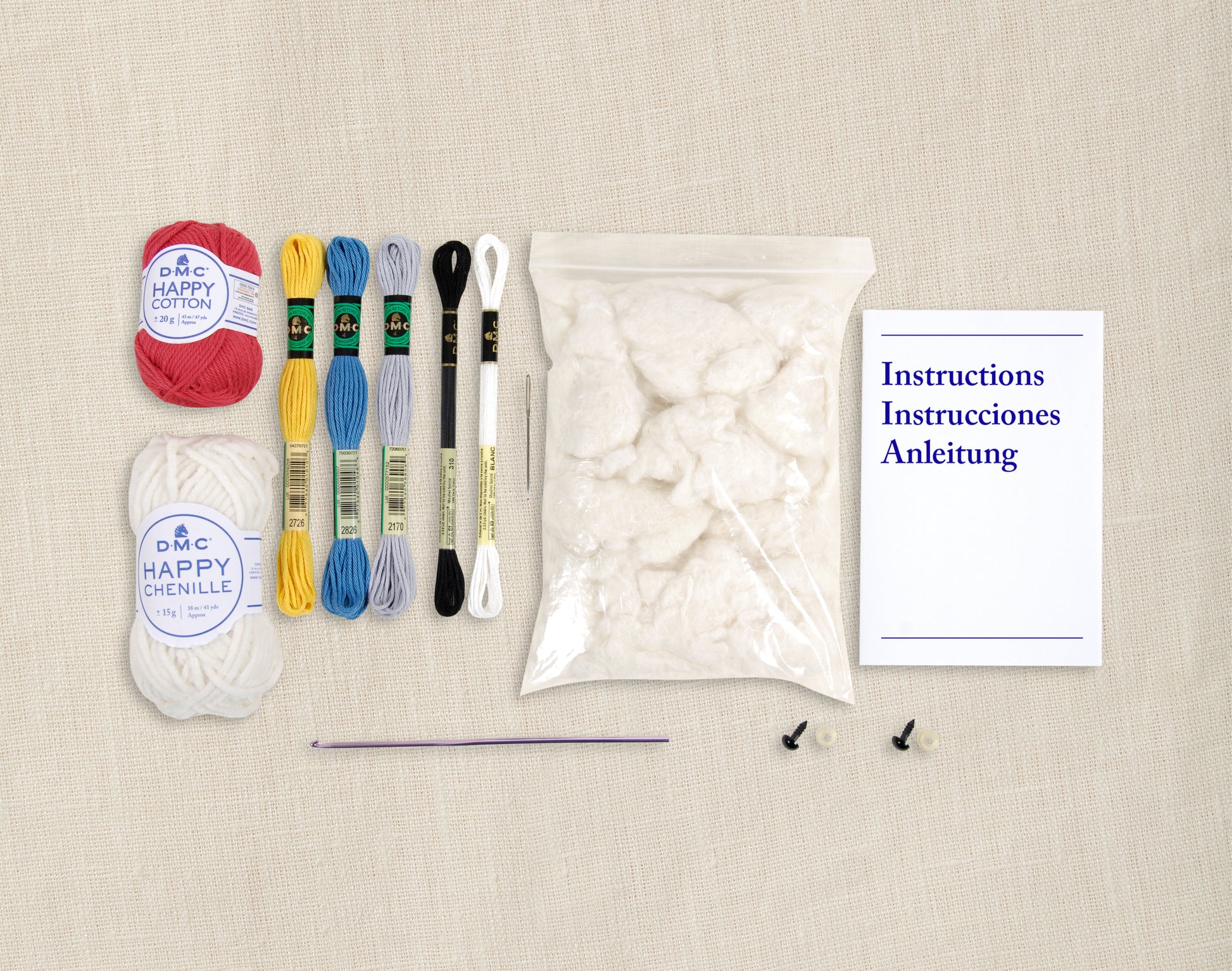 El kit utiliza hilos Happy Cotton y Happy Chenille de DMC, que se combinan para lograr una textura suave, mullida y visualmente única. Gracias a sus instrucciones detalladas paso a paso, este proyecto es perfecto tanto para principiantes con nociones básicas como para crocheteros experimentados que buscan un diseño divertido y diferente.