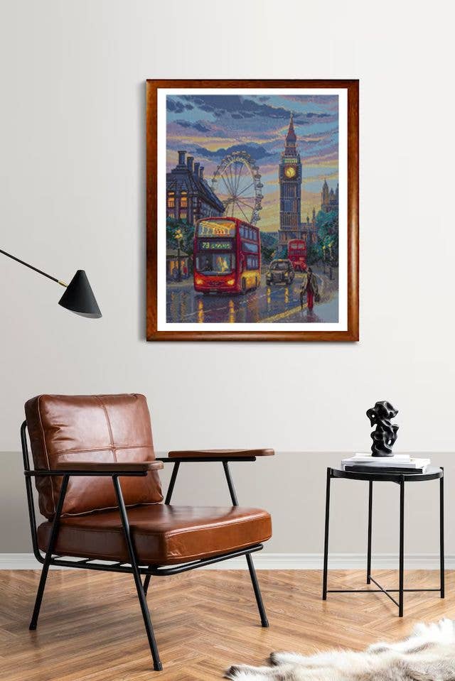 Sumérgete en el encanto británico con el kit de punto de cruz RIOLIS “Londres Lluvioso”, un diseño que retrata a la perfección la atmósfera única de la capital inglesa. La escena muestra el icónico Big Ben y el London Eye al fondo, junto a un par de clásicos autobuses rojos de dos pisos y un taxi negro tradicional. Todo ello envuelto en la luz cálida del atardecer después de una lluvia, donde los reflejos de las farolas y vehículos se dibujan en el pavimento mojado.