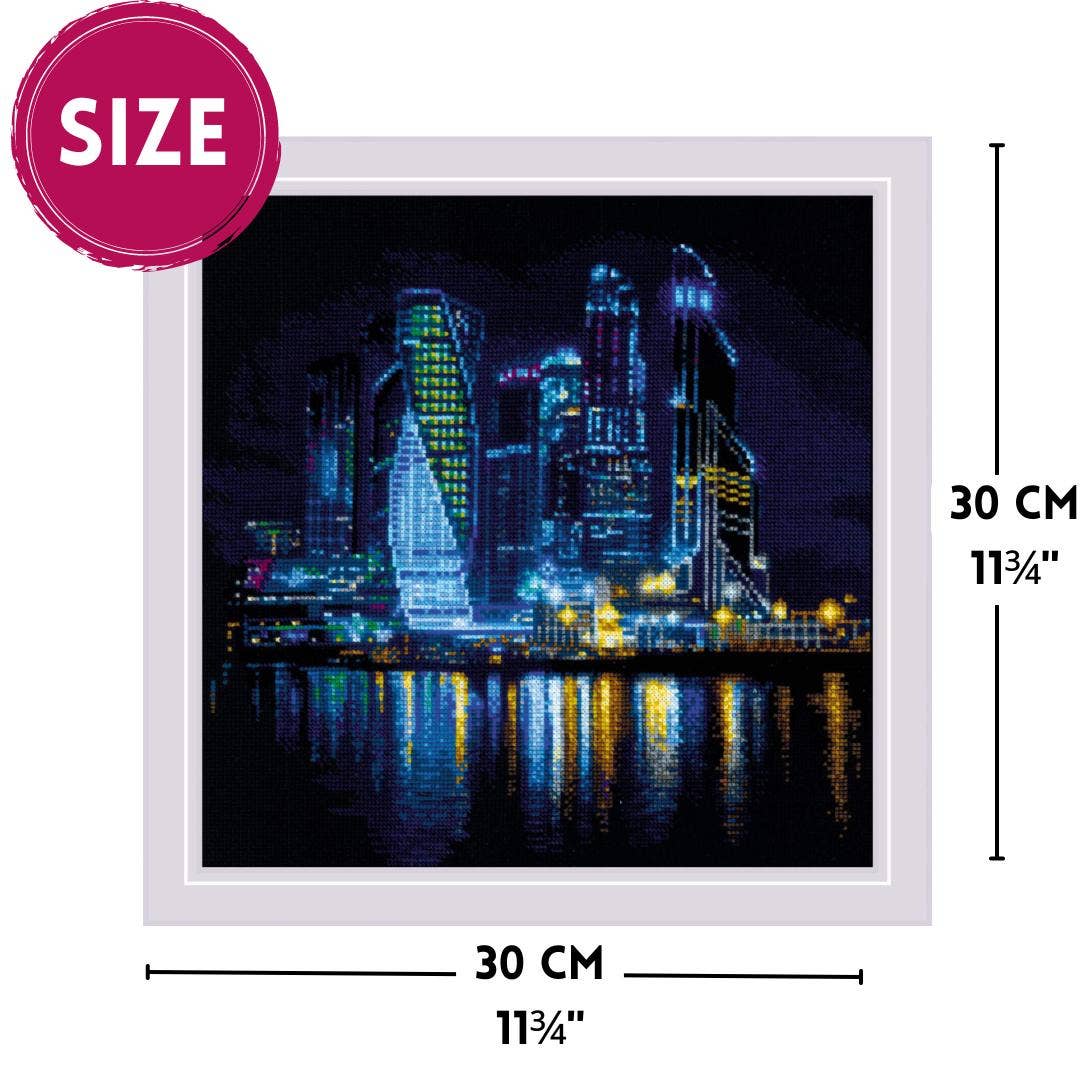 Descubre la belleza urbana con el kit de punto de cruz RIOLIS “Ciudad Nocturna”, un diseño espectacular que captura una vista panorámica de imponentes rascacielos iluminados reflejándose en el mar bajo el cielo nocturno.