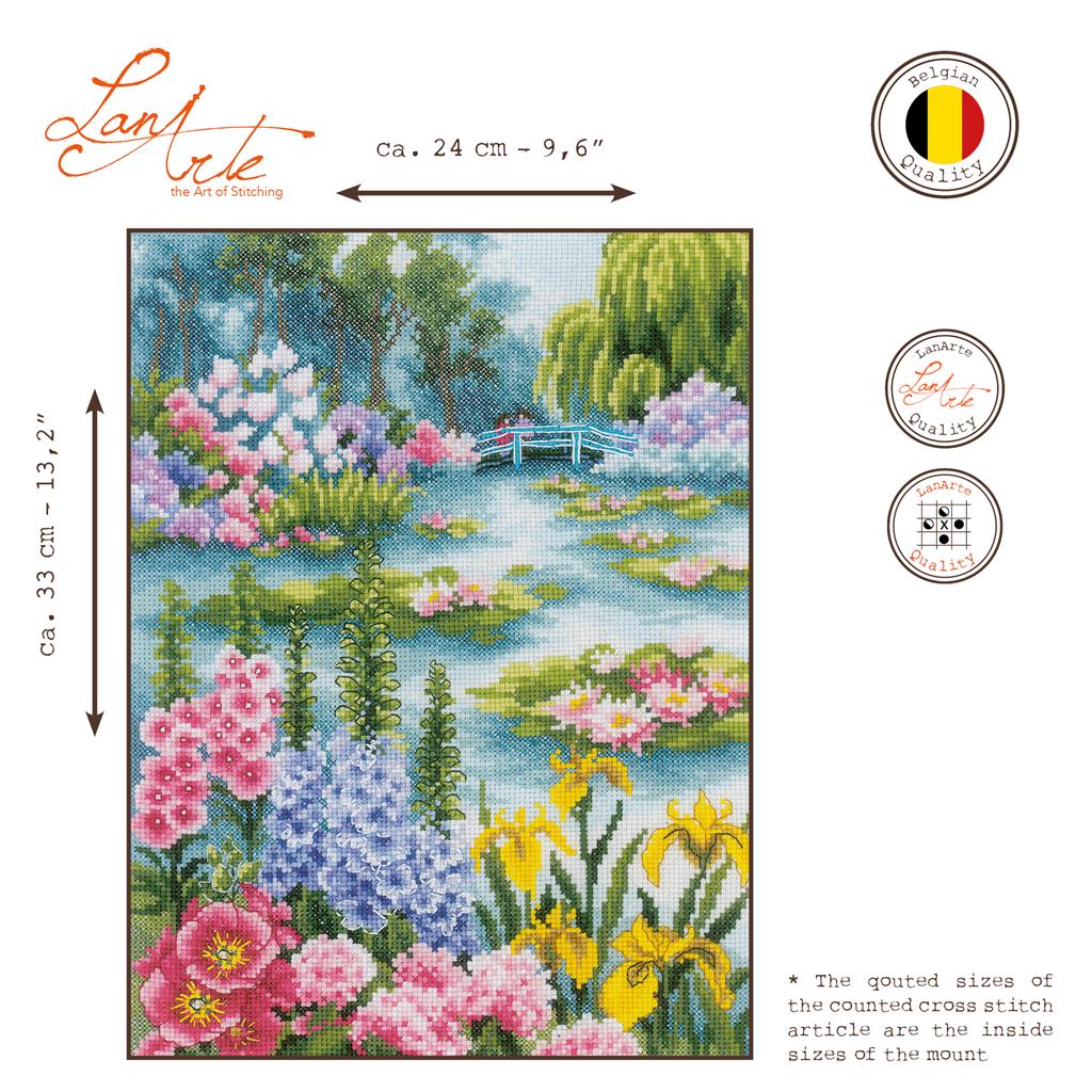 El Kit de Punto de Cruz - Estanque de Nenúfares de Lanarte te permitirá bordar un hermoso paisaje con nenúfares en flor, reflejos en el agua y un elegante puente de madera azul. Un diseño lleno de serenidad y color, perfecto para los amantes de la naturaleza y el bordado.