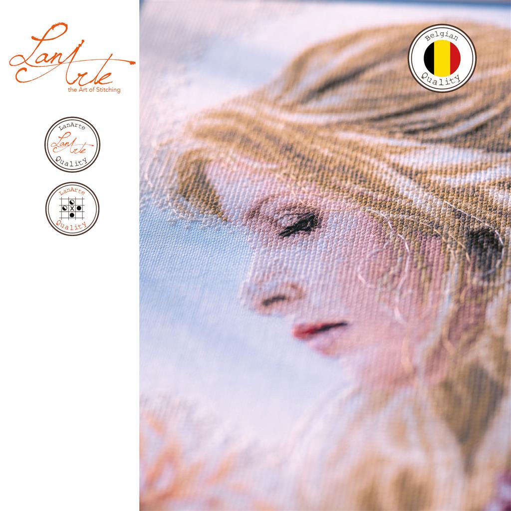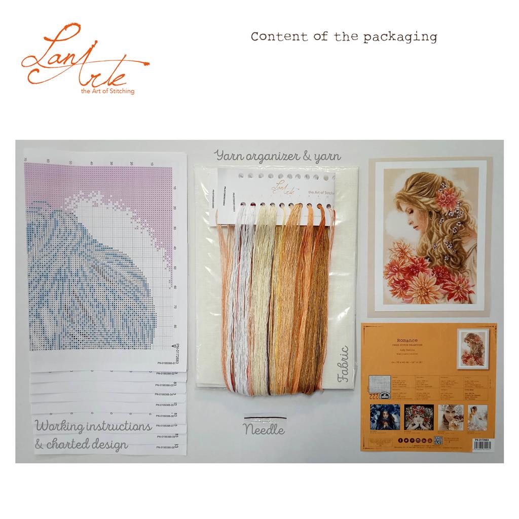 Descubre la elegancia y el encanto del bordado con el exclusivo kit de punto de cruz "Lady Dahlia" de Lanarte. Este diseño premium captura la delicada belleza de una mujer con largos cabellos dorados adornados con pequeñas flores y espectaculares dalias en tonos cálidos y vibrantes. La sutileza de su expresión y el juego de luces en el fondo le aportan un aire etéreo, convirtiéndolo en una verdadera obra de arte.