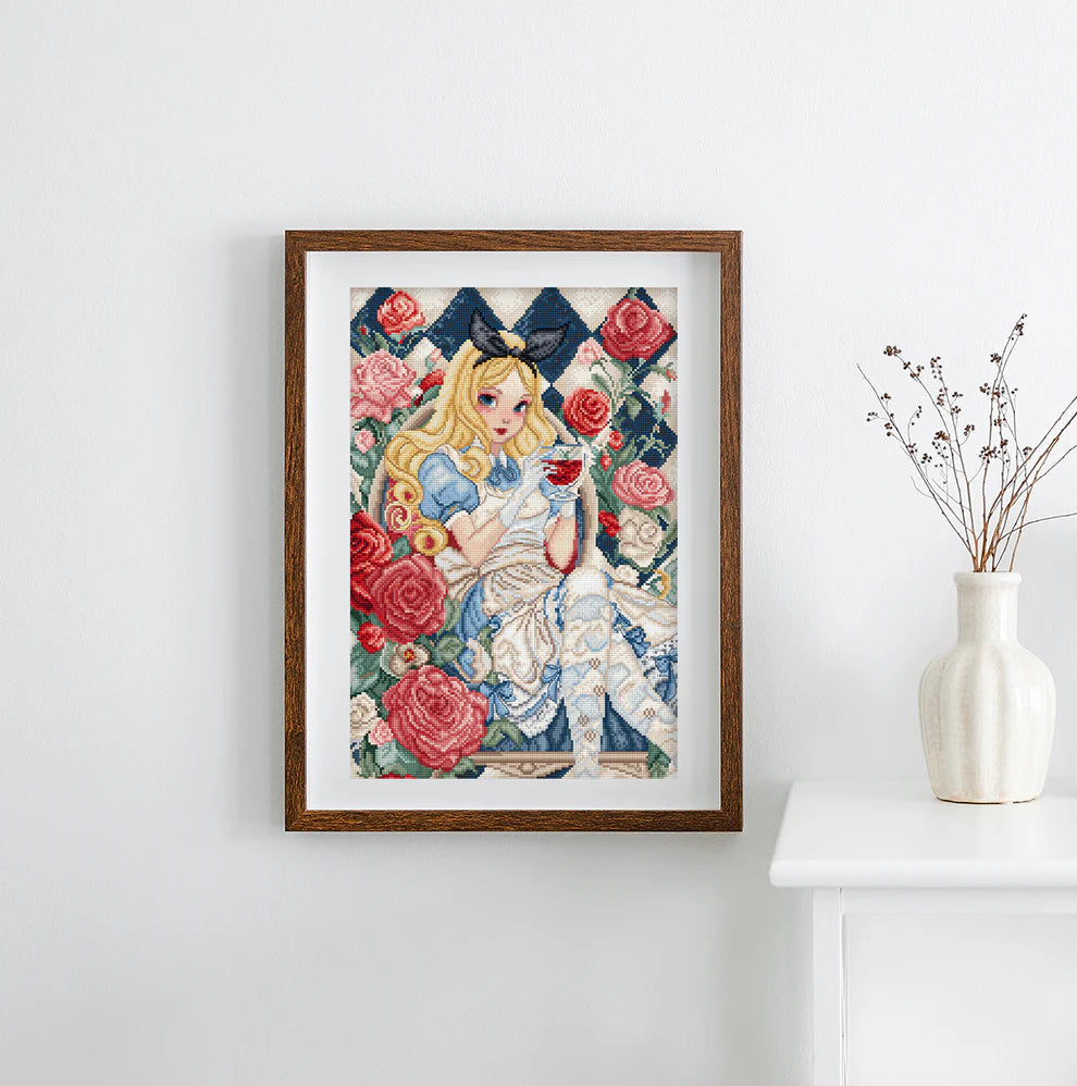 El Kit de Punto de Cruz Letistitch “Un Vistazo al País de las Maravillas” te invita a adentrarte en un universo de fantasía inspirado en el clásico cuento de Alicia en el País de las Maravillas. El diseño muestra a una joven de mirada enigmática y aire soñador, rodeada de rosas rojas y tonos pastel, con un estilo artístico moderno y elegante que mezcla lo clásico con lo contemporáneo.