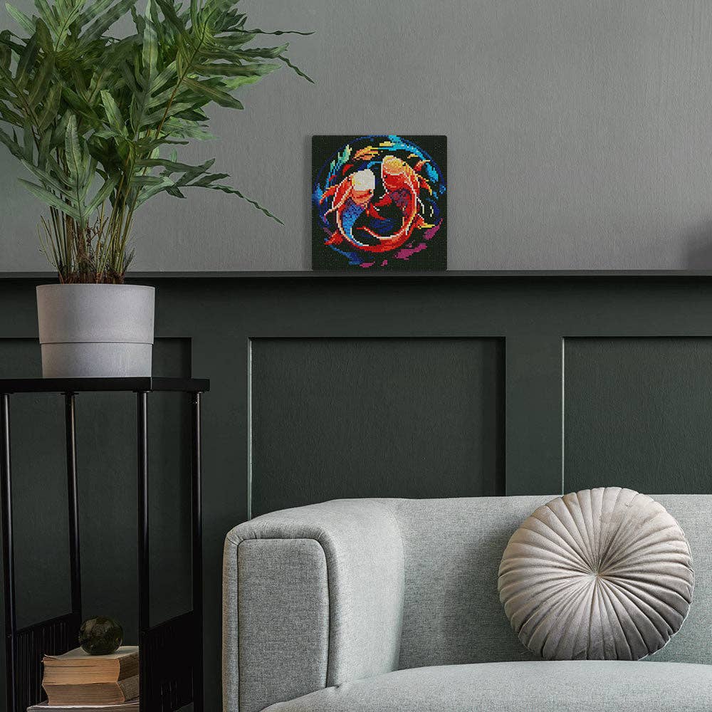 El kit de punto diamante Carpas Koi Coloridas de Figured'Art (Racesa) es un mini cuadro en lienzo de gran impacto visual y simbolismo. El diseño representa dos carpas koi girando en un movimiento circular, con colores intensos y contrastes vibrantes que evocan equilibrio, prosperidad y energía positiva, valores tradicionalmente asociados a estas figuras.
