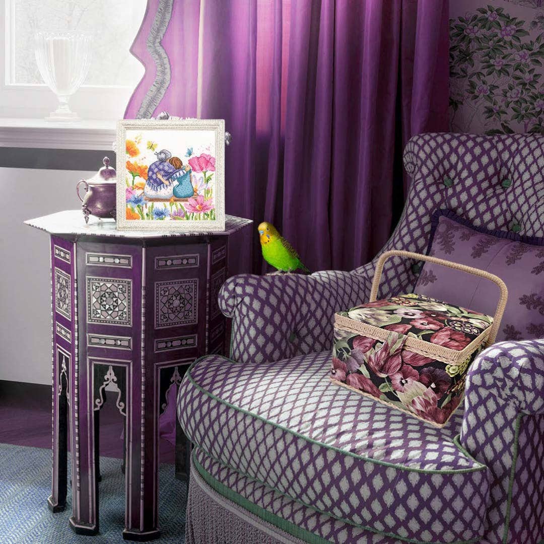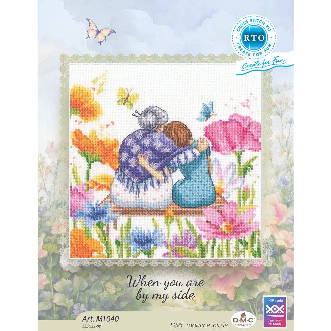O kit de ponto cruz RTO Avó Dia da Mãe é um design terno e emotivo que representa uma avó e a sua neta abraçadas num lindo jardim cheio de flores coloridas. Uma cena cheia de carinho e ternura que transmite o amor entre gerações, ideal para bordar e oferecer em ocasiões especiais como o Dia da Mãe, aniversários ou como recordação familiar.